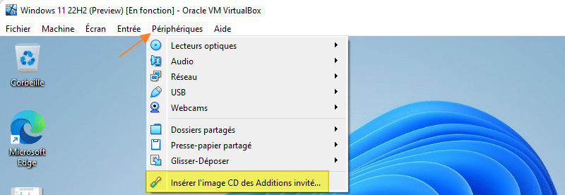 Dans la fenêtre de la machine virtuelle, cliquez sur le bouton "Périphériques" puis "Insérer l'image CD des additions invités...".