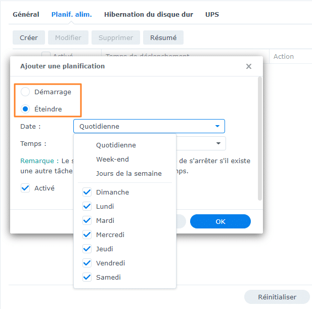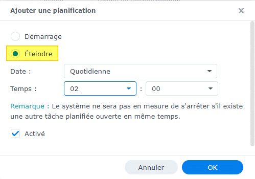 Une fois que l'action est choisie, et les jours également, vous devez préciser l'heure à laquelle vous souhaitez réaliser cette action. Il faudra penser aussi à cocher la case "Activé" sinon la tâche sera créée, mais non appliquée. Dans l'exemple ci-dessous, le NAS s'éteindra à 02h00 du matin tous les jours de la semaine, y compris le week-end, car j'ai des sauvegardes nocturnes à faire tourner.