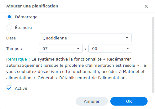 - Démarrer le NAS à 07h00 du lundi au vendredi et à 09h00 le week-end