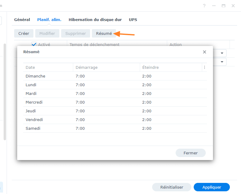 Le bouton "Résumé" permet d'avoir une synthèse au jour le jour des phases de démarrage et d'arrêt du NAS. De quoi vérifier que la configuration est bonne ! 🙂