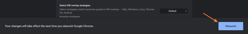 A partir du moment où vous modifiez la valeur de l'option "Reading List", un bouton "Relaunch" apparait en bas à droite de Chrome : cliquez dessus pour que Chrome se ferme et se relance automatiquement. C'est une action indispensable pour que la modification soit prise en compte et que la Liste de lecture ne s'affiche plus.