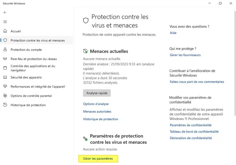 Une fois dans la section "Protection contre les virus et menaces", cliquez sur "Gérer les paramètres".