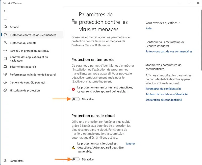 Il suffit de réactiver la protection en temps réel depuis Sécurité Windows ou de rétablir les valeurs de registre et tâches/mécanismes désactivés. Autrement dit, annulez les actions effectuées en remettant les composants dans leur état d'origine.