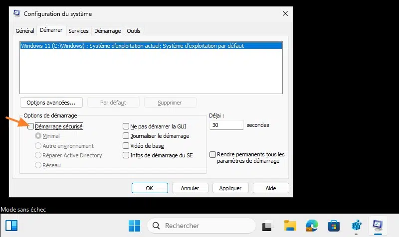 Quand c'est fait, vous devez désactiver le mode sans échec et redémarrer la machine. Retournez dans "msconfig" afin de décocher l'option "Démarrage sécurisé".