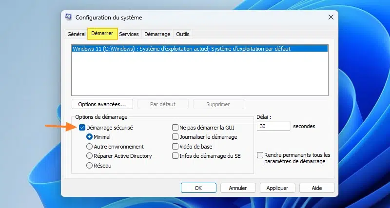 Vous devez redémarrer votre PC en mode sans échec de façon à pouvoir désactiver le démarrage de certains services. Accédez à "msconfig" (Configuration du système), cliquez sur "Démarrer" et cochez l'option "Démarrage sécurisé" (en mode minimal). Cliquez sur "OK" et validez. Redémarrez votre PC.