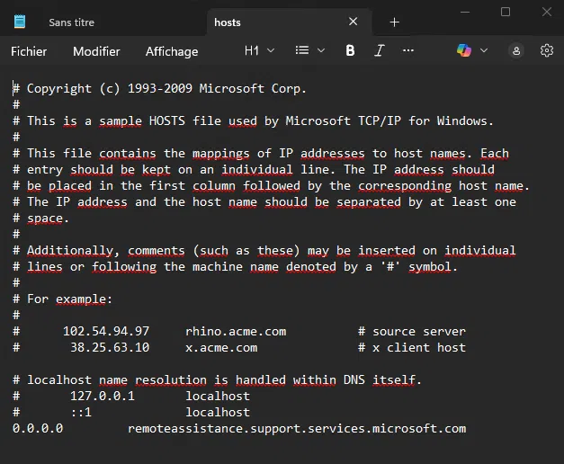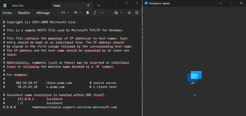 Vous pouvez empêcher Quick Assist de contacter les serveurs de Microsoft en jouant sur la résolution du nom suivant : remoteassistance.support.services.microsoft.com. Pour cela, vous pouvez modifier le fichier hosts de votre machine Windows afin d'y ajouter la règle suivante :