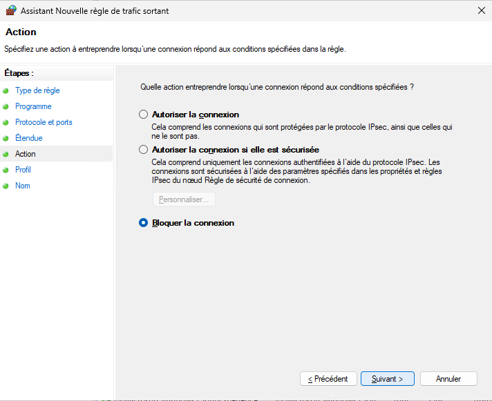 | Bloquer l'exécutable dans Windows Defender | - Règle au niveau local (Windows), indépendante du réseau. - Bloque toute tentative de connexion sortante de l'application. | - Ne protège pas contre des mises à jour futures susceptibles de changer l’emplacement de l’exécutable. |