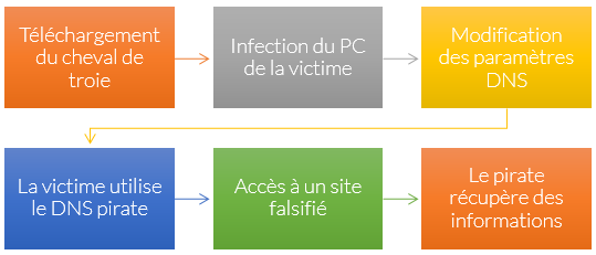 Quand cela arrive, le serveur DNS pirate se fera un plaisir de faire la translation du nom de domaine de votre banque, moteur de recherche, Facebook, Twitter, etc.. vers l'adresse IP d'un site falsifié.