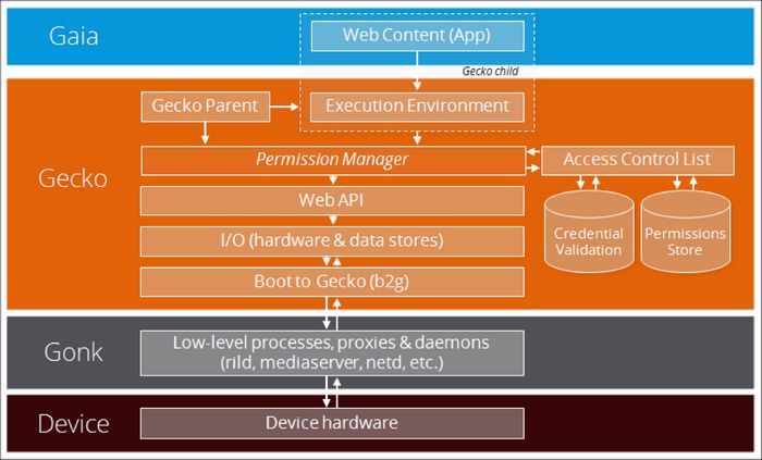 Firefox OS repose sur différents éléments, un périphérique mobile bien entendu, mais aussi Gaia, qui est en charge de l'interface utilisateur entièrement écrite en HTML/CSS/JS, des applications utilisateurs et système (appels, SMS, e-mails).