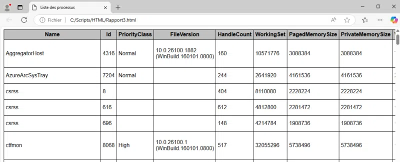 Get-Process | ConvertTo-Html -Title "Liste des processus" | Out-File "C:\Scripts\HTML\Rapport2.html"