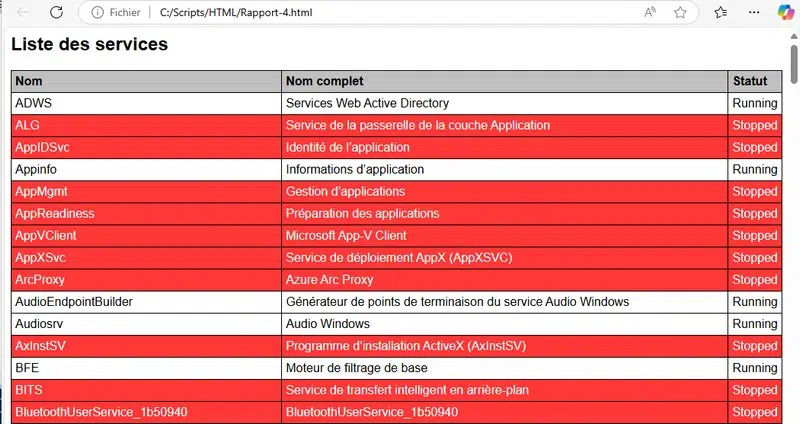 L'objectif sera le suivant : exporter la liste des services de la machine locale et ajouter du rouge comme couleur de fond sur toutes les lignes où le service est actuellement arrêté.