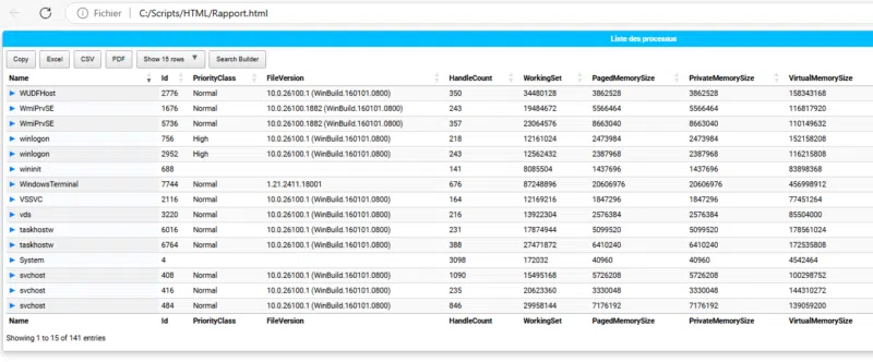 Venons-en désormais au code basé sur PSWriteHtml pour construire le rapport HTML.