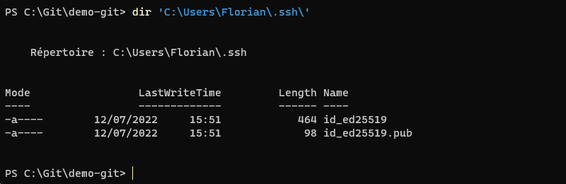 Dans le répertoire ".ssh" de mon utilisateur, j'ai bien ma paire de clés :