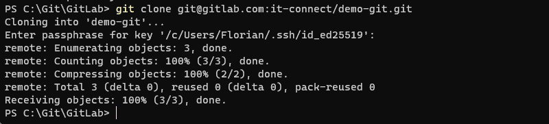 Sachez également que le projet sera cloné dans un sous-répertoire du répertoire courant, pour ma part dans "C:\Git\GitLab", ce qui donnera "C:\Git\GitLab\demo-git".