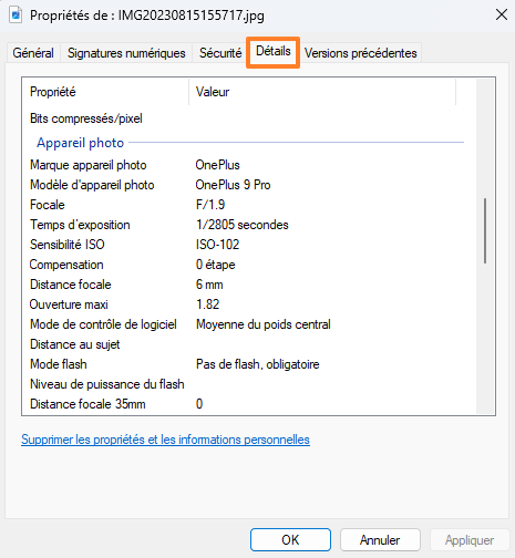 Sur Windows, vous pouvez consulter ces informations dans les propriétés du fichier, via l'onglet "Détails". Windows affiche les métadonnées EXIF, mais il n'y a pas toujours toutes les informations.