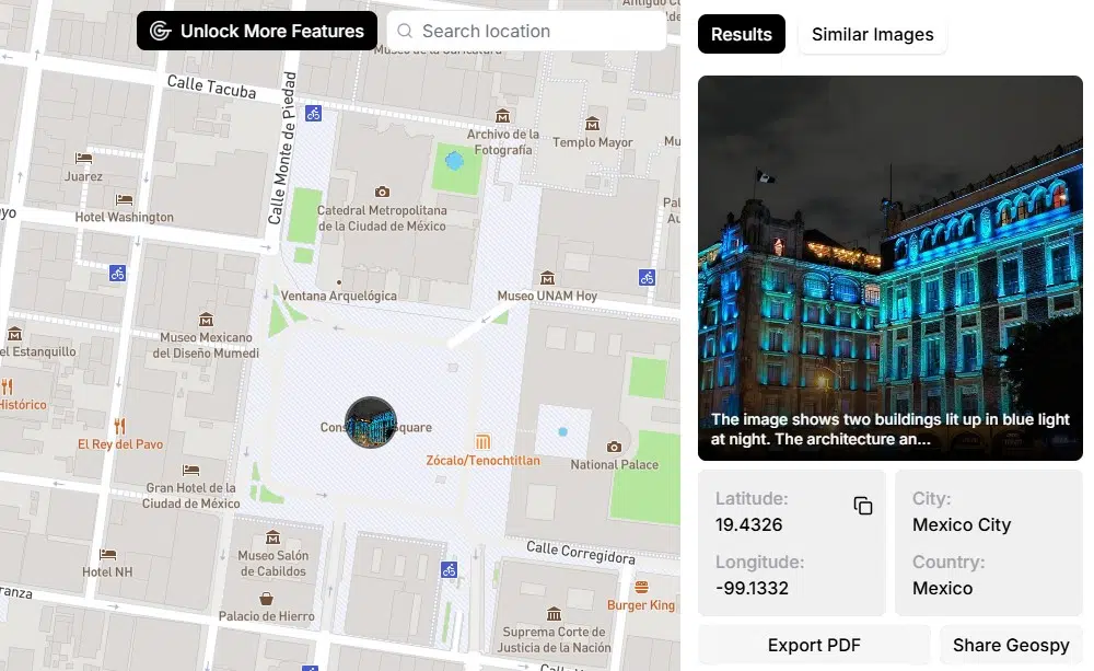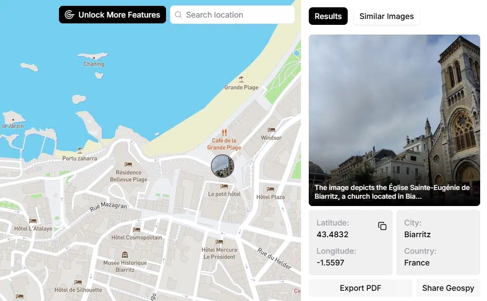 J'ai ensuite pris d'autres photos et j'ai relancé le test sur le même principe. Sur ces photos, prises respectivement au Mexique, à Strasbourg et à Biarritz, il y a un élément reconnaissable (un monument, par exemple). À chaque fois, l'outil GeoSpy est parvenu à identifier l'emplacement de la photo ! C'est quand même très pratique et impressionnant.