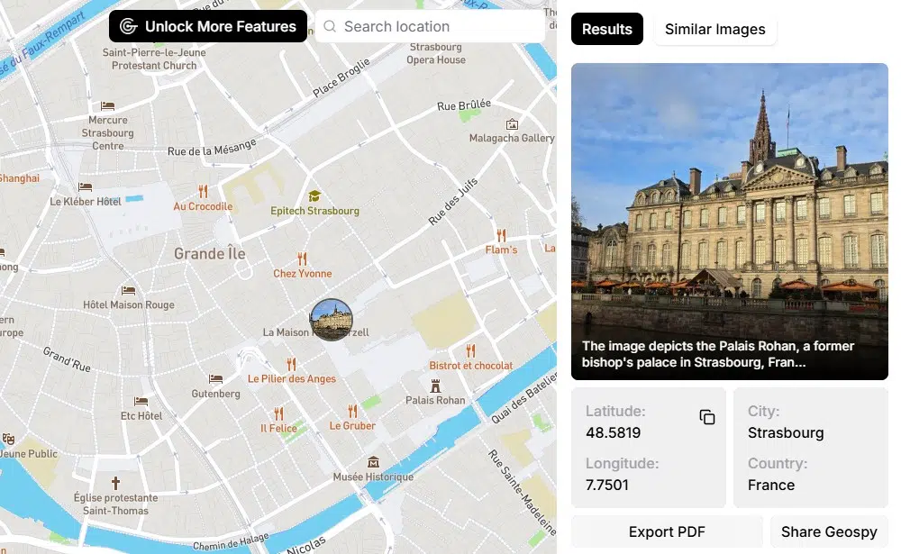 Vous pouvez exporter les résultats de votre recherche au format PDF, mais aussi afficher des images similaires. Cela peut être l'occasion de vérifier le résultat de GeoSpy.