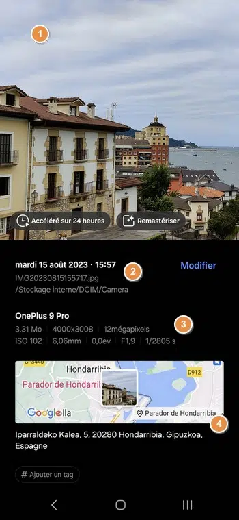 Lorsque vous consultez les détails d'une photo sur votre smartphone, vous êtes susceptible d'avoir un affichage tel que celui présenté ci-dessous (cela peut varier d'un modèle à un autre) :