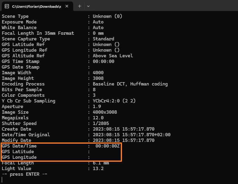 Dans ce cas, il est préférable de s'orienter vers l'outil ExifTool disponible sur Windows, Linux et macOS (et même en ligne). Un outil en ligne de commande. Il suffit de glisser-déposer le fichier image à analyser sur l'exécutable "exiftool(-k).exe" de l'outil pour afficher les informations EXIF dans une console comme celle ci-dessous. Ici, nous pouvons constater que les coordonnées GPS sont vides.
