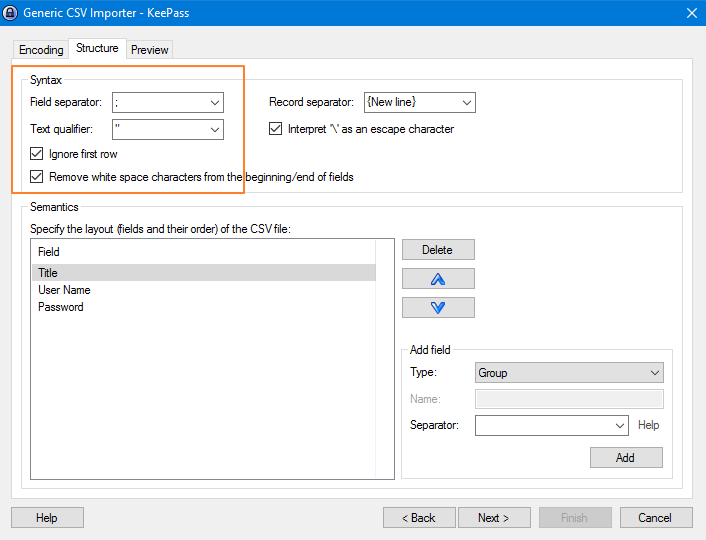 Nous allons ensuite regarder de plus près la configuration du bloc "Syntax" puisque le séparateur n'a pas l'air correct (Field Separator). En effet, par défaut Excel génère des CSV avec un séparateur ";" en revanche dans KeePass la virgule est indiquée par défaut, il faut changer cela.