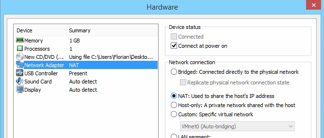 Concernant la partie connexion réseau, que l'on trouve dans Network Adapter, je choisis de laisser la machine en NAT afin qu'elle utilise mon hôte physique pour accéder à internet.