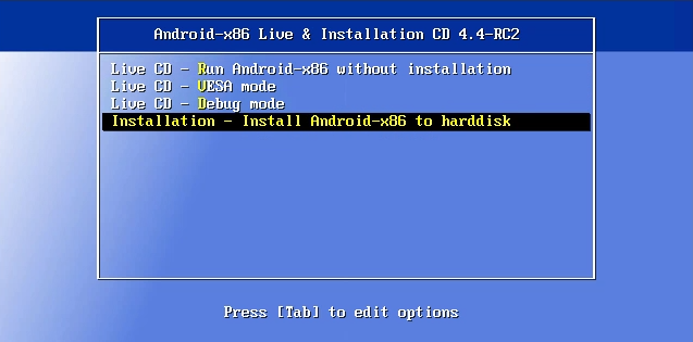 L'installation est très simple, il faudra juste être rigoureux au moment du partitionnement. Pour le reste, c'est très bien guidé. Lorsque vous démarrez sur l'ISO, un menu apparaît. Sélectionnez "Installation - Install Android-x86 to harddisk" et appuyez sur Entrée, pour installer Android sur votre disque dur virtuel.