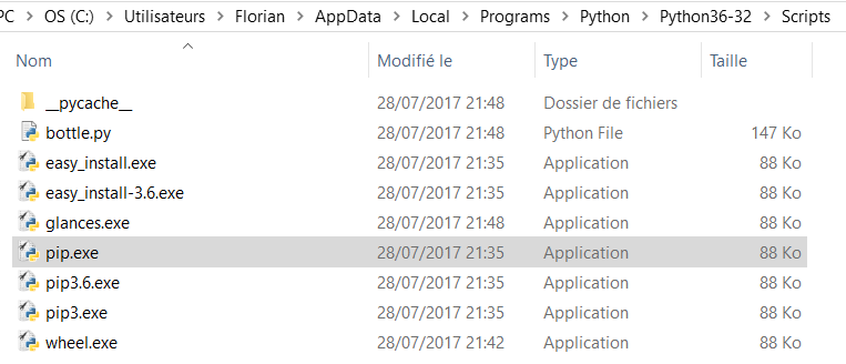 Il est à noter que l'exécutable de "Pip" sera stocké dans le dossier "Scripts" de Python, ce qui nous mène au chemin suivant : C:\Users\<votre-utilisateur>\AppData\Local\Programs\Python\Python36-32\Scripts