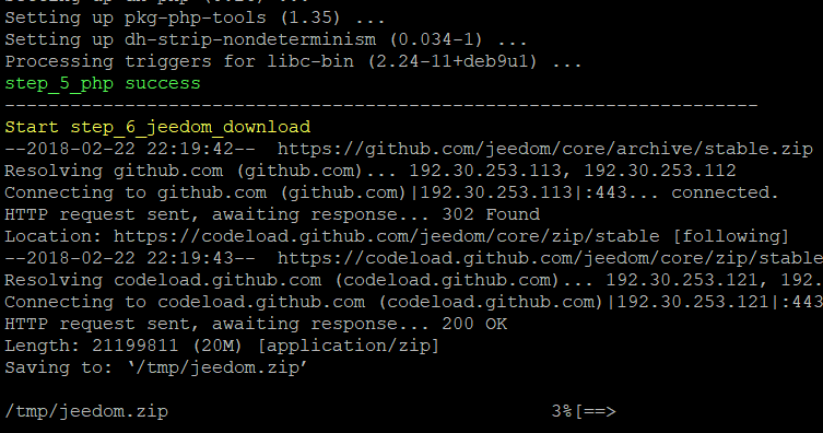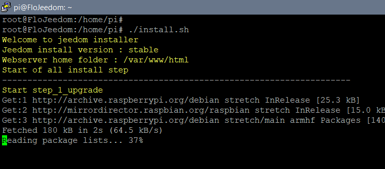 Le processus d'installation est totalement autonome et effectuera pour vous : l'installation des dépendances, l'installation de MySQL, l'installation d'Apache et bien sûr l'installation de l'application Jeedom. A la fin de l'installation, vous penserez à noter le mot de passe root de MySQL généré pendant l'installation.