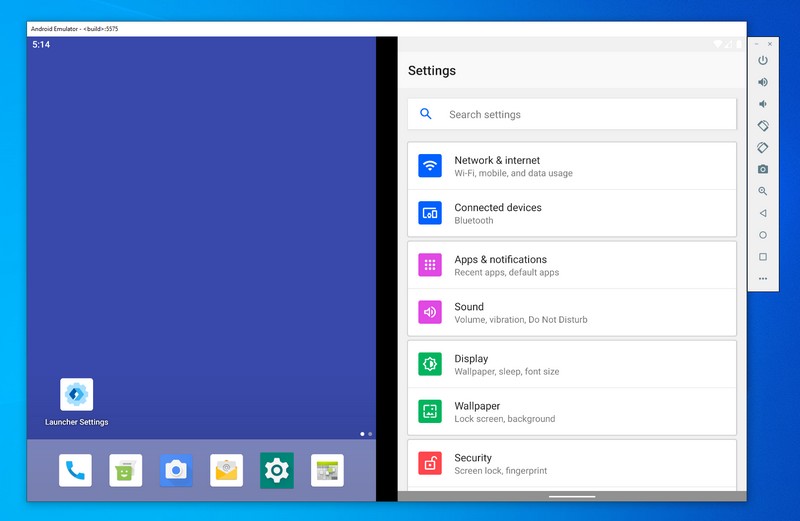 La barre d'actions sur la droite contient les boutons de contrôle ainsi que l'accès aux paramètres, ce qui est pertinent pour simuler certains comportements (exemple : jouer avec le niveau de batterie).