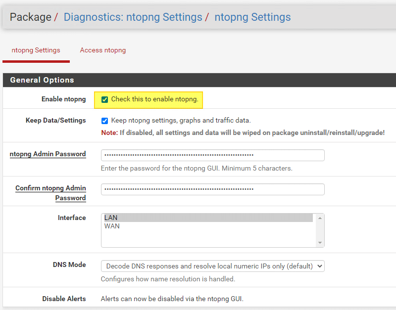 Cochez l'option "Enable ntopng" afin d'activer les services correspondants. Profitez-en pour définir un mot de passe admin via l'option "ntopng Admin Password" et l'option juste en dessous pour la confirmation.