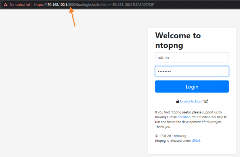 Descendez tout en bas de la page et cliquez sur "Save" : NtopNG sera alors accessible à partir du lien "ntopng". Un nouvel onglet va s'ouvrir, sur le port 3000. Connectez-vous avec le compte "admin" et le mot de passe que vous avez choisit.