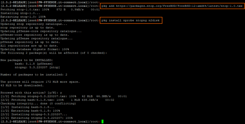 La console indique que Bash 5.1.8 et NtopNG 5.3.220207 vont être installés : une bonne nouvelle ! 🙂 - Validez avec "y" puis Entrée.