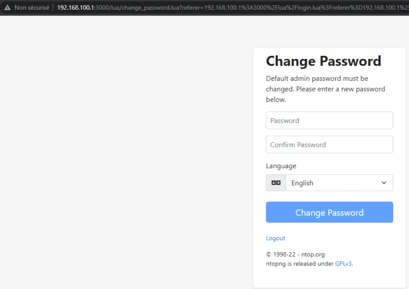 Sauvegardez avec la touche Echap suivi de ":wq!" puis Entrée. Vous pouvez accéder à NtopNG via l'adresse IP de votre PfSense et le port 3000. Cette fois-ci, il faut s'authentifier avec le compte "admin" et le mot de passe "admin" puis définir un nouveau mot de passe.
