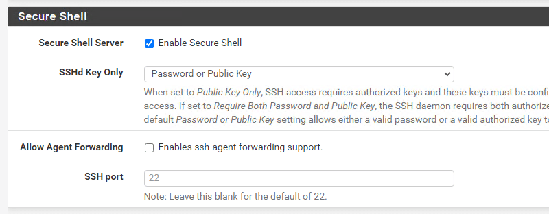 Pour réaliser l'installation en ligne de commande, je vous recommande d'activer temporairement l'accès SSH sur votre pare-feu PfSense. Ce sera plus facile pour copier-coller les commandes, plutôt qu'avec la console. À vous de voir. Le SSH peut être activé sous le menu "System" dans "Advanced" puis il suffit de cocher l'option "Enable Secure Shell".