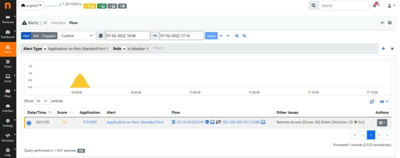 NtopNG est capable de capturer et analyser les flux des différentes interfaces réseau de votre pare-feu Pfsense, y compris sur la partie OpenVPN. Par exemple, sur l'image ci-dessous je consulte les alertes remontées sur l'interface "ovpns1" correspondante à mon VPN SSL client-to-site. L'alerte "Application on Non-Standard Port" s'est déclenchée, car j'effectue du RDP au travers du VPN sur un port non standard : 13389 au lieu de 3389, donc NtopNG trouve cela suspect, car ce flux pourrait correspondre à du trafic malveillant et dissimulé.