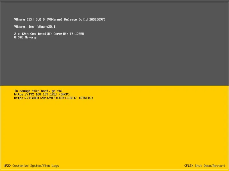 Lorsque le redémarrage sera complété, vous verrez l’interface DCUI (Direct Console User Interface). Au besoin, vous pouvez personnaliser la configuration réseau en appuyant sur « F2 », mais vous voulez sûrement découvrir l’interface web de ESXi avant !
