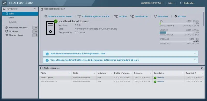Connectez-vous avec le compte root pour découvrir l’interface web de votre hyperviseur.