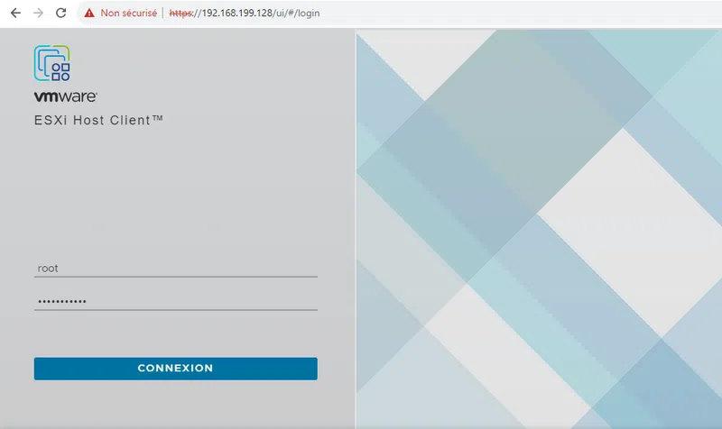Acceptez l’avertissement du navigateur (il n’y a pas de certificat) et vous aurez accès à ESXi Host Client.