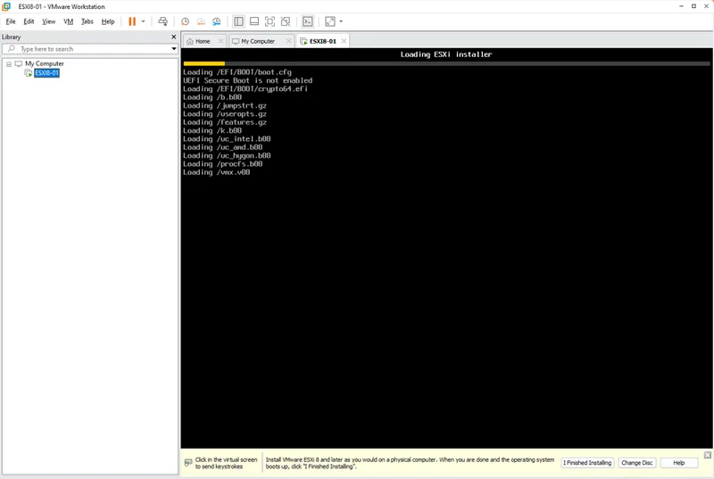 Après avoir terminé la création de votre machine virtuelle, elle sera mise sous tension dans Workstation 17. Le chargement de ESXi installer peut prendre quelques minutes, selon les ressources que vous avez allouées à la VM.