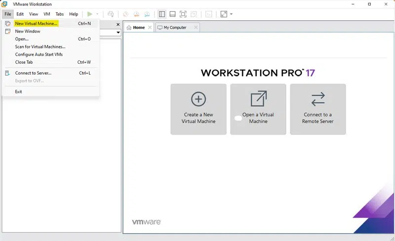 Dans le menu principal, appuyez sur « File », puis sur « New Virtual Machine ».