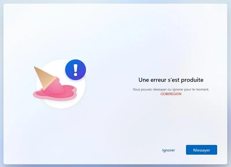 Après la première phase de l'installation, Windows 11 va afficher le message "Une erreur s'est produite - OOBEREGION" qui est la conséquence de la région choisie au début de l'installation. Ce n'est pas gênant, puisque l'on peut poursuivre l'installation !