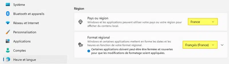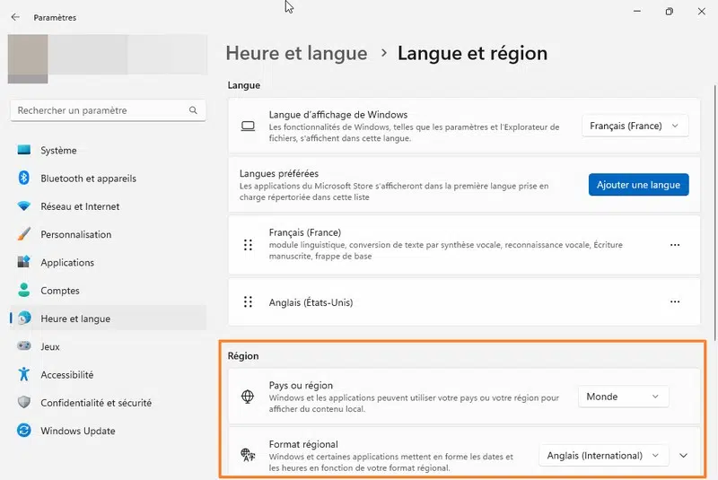Ouvrez les paramètres, cliquez sur "Heure et langue" puis sur "Langue et région". Ici, vous pouvez constater que le pays est "Monde" et le format régional sur "Anglais (International)".