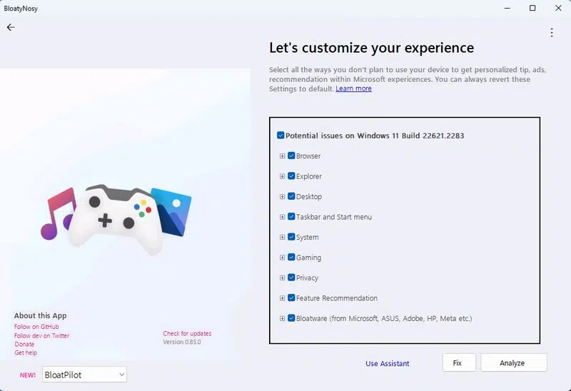 Cet outil intègre une fonction nommée BloatPilot qui sert à supprimer les applications de votre choix en quelques clics. Il intègre aussi d'autres fonctions pour tuner le système afin de désactiver la télémétrie, etc.