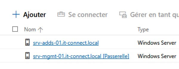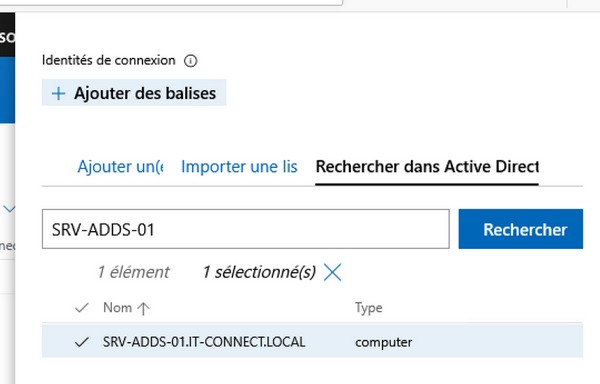 Si votre serveur est dans le domaine, cliquez sur "Rechercher dans Active Directory", puis saisissez son nom et cliquez sur "Rechercher". Il doit apparaître dans les résultats, sélectionnez-le. Pour ma part il s'agit de mon contrôleur de domaine SRV-ADDS-01.