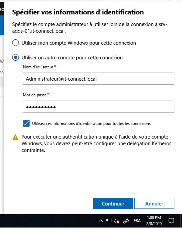 Indiquez l'UPN de votre utilisateur et son mot de passe. Pour que ce compte devienne le compte par défaut lorsque vous établissez une connexion sur un serveur, cochez l'option "Utilisez ces informations d'identification pour toutes les connexions". Cliquez sur "Continuer".