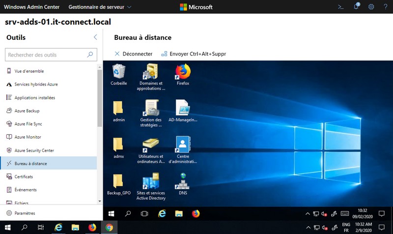 Si l'authentification réussie, vous devriez voir l'état de votre serveur et vous pourrez alors commencer à le manager via Windows Admin Center. Sur la gauche, vous retrouvez l'accès aux différents outils, alors qu'au centre s'affiche la fenêtre correspondante à l'outil sélectionné.