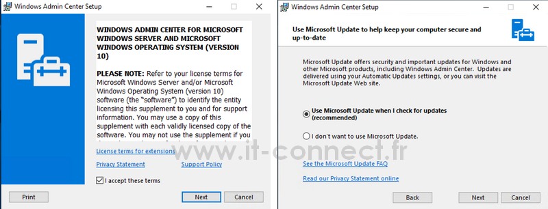 Pour la première étape, acceptez le contrat de licence. Ensuite, vous pouvez décider d'activer les mises à jour via Microsoft Update notamment pour WAC.