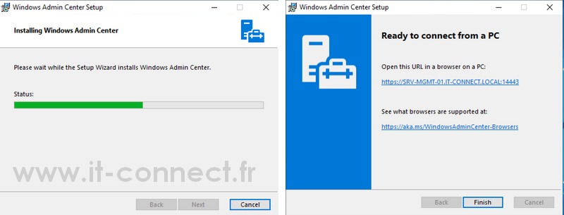 L'assistant affiche l'URL d'accès à WAC : "https://srv-mgmt-01.it-connect.local:14443" dans mon cas. Vous pouvez cliquer sur le lien directement.