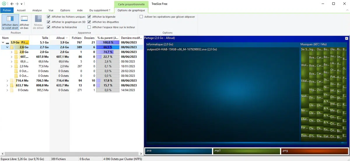 - En bas, la représentation graphique des fichiers où chaque bloc représente un fichier, et chaque couleur est associée à un type de fichiers