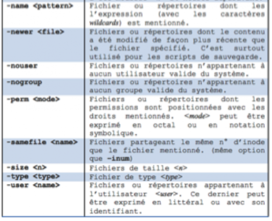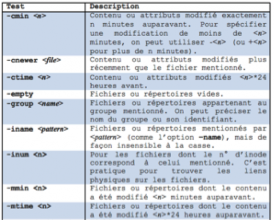 La commande find supporte de nombreux tests. Ci-dessous voici un petit résumé des principaux utilisés :